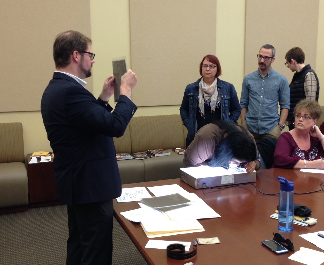 Some photographs from our November workshop, presented by Jeff Thompson, photo archivist at Twentieth Century Fox Studios. The half-day workshop covered the identification and proper archival care of twentieth century still film formats. Instruction included discussion of nitrate film, acetate film, and color transparency film as well as recommendations of archival supplies. A tour of the vault was also included.